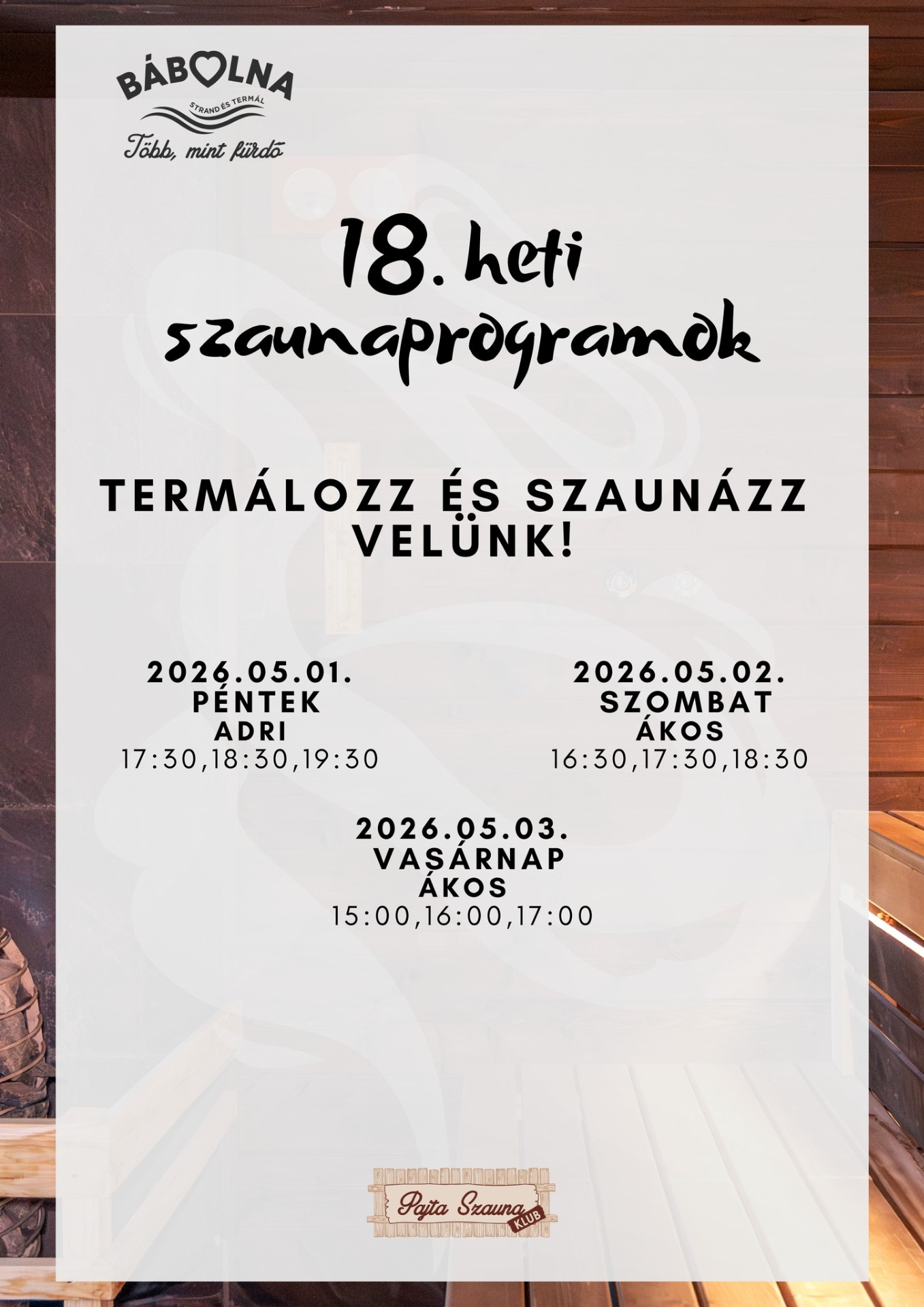 Kapcsolódj ki, lazulj el és élvezd különleges szaunaszeánszainkat ezen a héten is a Bábolna Strand- és Termálfürdőben! 🌿💦